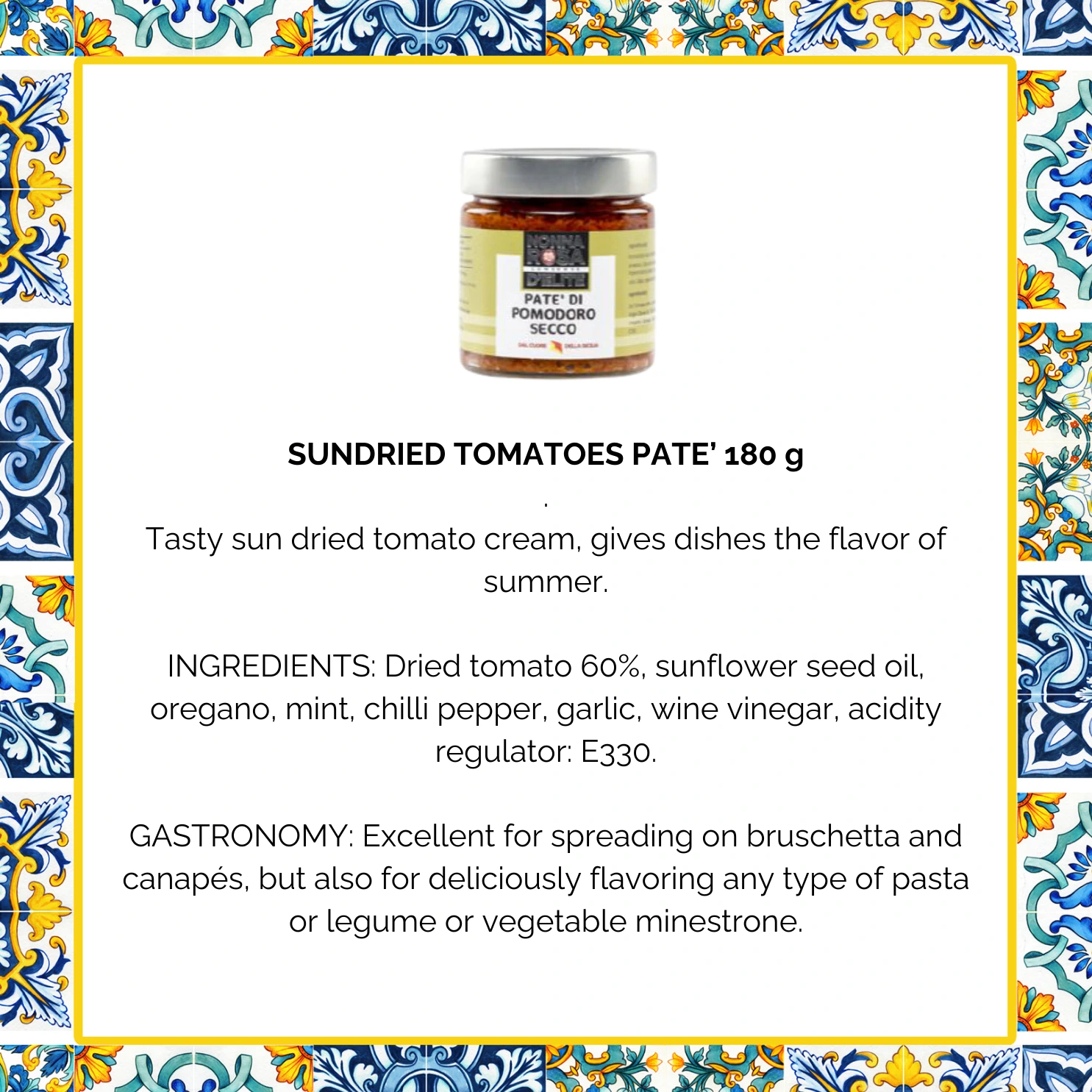 | Which Jar would you like to order | Sicilian Pesto di Pistacchio 200g (savoury) £9, Sicilian Pistacchio Spread 200g (sweet) £9, Dry tomatoes with capers and anchovies £6.50, Sicilian Caponata (Mixed Aubegine based and vegetable preserve) £6.50, Dry Tomatoes Pate' £6.50, Artichokes Pate' £6.50, Green Olives and Capers Pate' £6.50, Black Olives Pate' £6.50, Bruschetta Mediterranea Spread £6.50, Bruschetta Montanara Spread £6.50, Pate' capriccioso £6.50, Tuna Stuffed Small Peppers £6.50 |